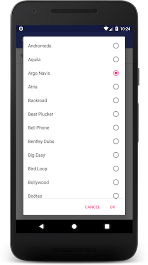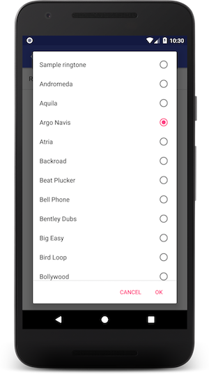 Вступление на этом заканчиваем, переходим к цели статьи. План такой: при нажатии на "Ringtone" открывается диалог со списком рингтонов и кнопками OK и Cancel, при выборе рингтона он проигрывается (как и в случае стандартного RingtonePreference